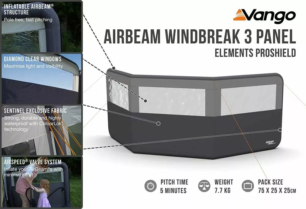The Vango Sentinel Airbeam 3 Panel Windbreak is an inflatable windbreaker to match your awning or tent, offering a 3-panel design to create a shaded area from the breeze. The Sentinel Exclusive fabric is lightweight, yet durable. A stable windbreak, with windows to help view the surroundings of the campsite.