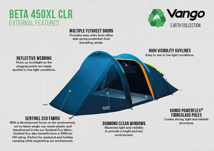 Updated design for 2023, the Beta 450xl CLR Tent is a Vango classic, part of the Earth collection, which is designed for short-term camping trips in Spring to Summer weather conditions. A simple yet popular tunnel structure, with a pole and sleeve design, and three fibreglass poles.