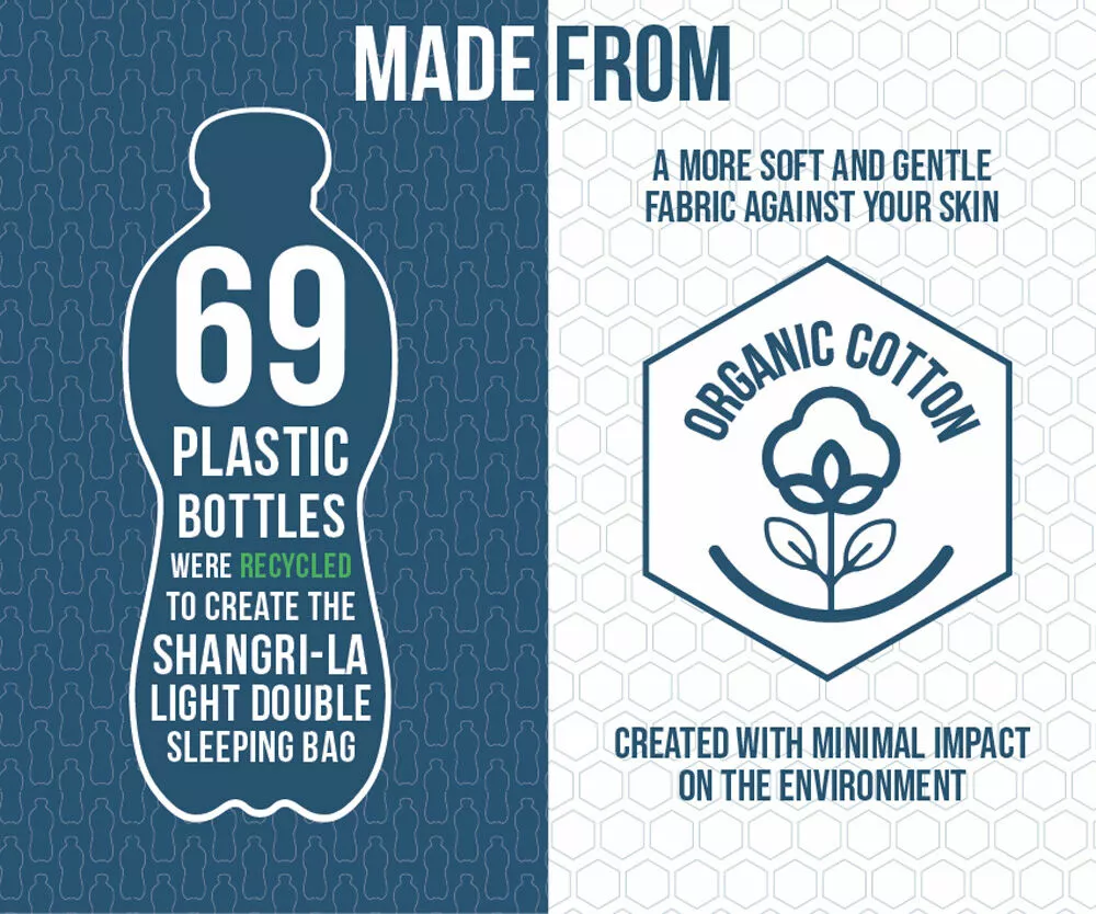 A luxury, lightweight double sleeping bag, designed to compliment the Vango Shangri-la collection of self-inflating mattresses, with the purpose of creating an amazing sleep set up, for maximum comfort. Designed with 100% polycotton exterior shell, made from recycled plastics, for a durable, yet soft-feel sleeping bag. The Shangri-La Light has zips on both sides of the bag for easier access and exit, without disturbing a partner.