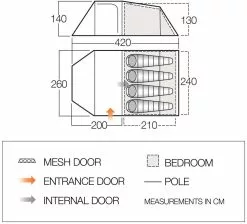 The Skye 400 tent by Vango, is the perfect weekend tent, ideal for short camping trips in fair weather conditions, such as festival events and entry-level camping during the Spring to Summer months. The Skye is a simple tunnel structure, with a fibreglass pole construction, offering a large porch space, and Nightfall Inner bedrooms, which are darkened for a better night’s sleep. Further to this, the linked-in groundsheet is ideal for providing a barrier to the elements in the living space, and clips into the flysheet to create a more sealed space. The Skye also features Clear PVC windows into the living space, which increase the amount of light inside the tent, making it feel like a larger, spacious area.
